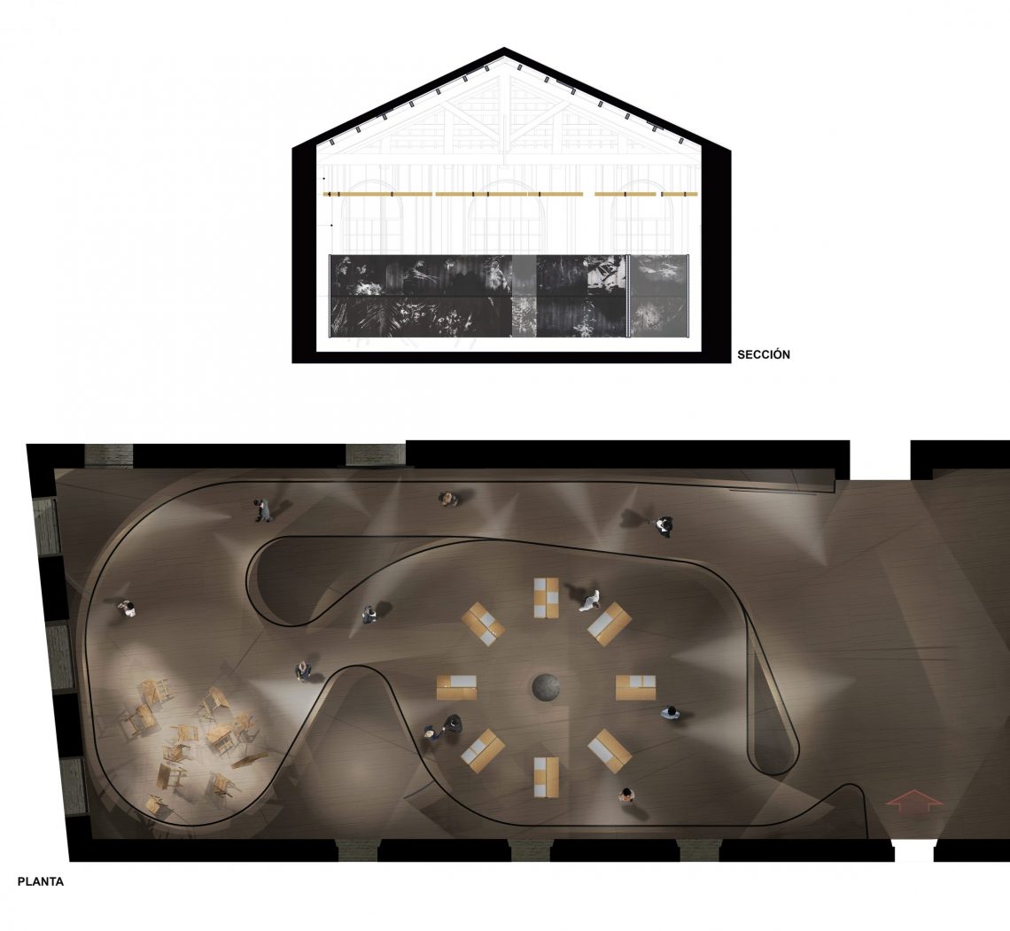 Un grupo de mesas y sillas traídas de las escuelas amazónicas nos desvelan un mapa de la precariedad actual dando testimonio de las duras condiciones en que interactúan profesores y alumnos. El recorrido termina en un espacio dedicado a explicar el Plan Selva con material gráfico, maquetas y proyecciones, un programa público a gran escala en la región amazónica peruana para la reconstrucción y refundación de cientos de escuelas.