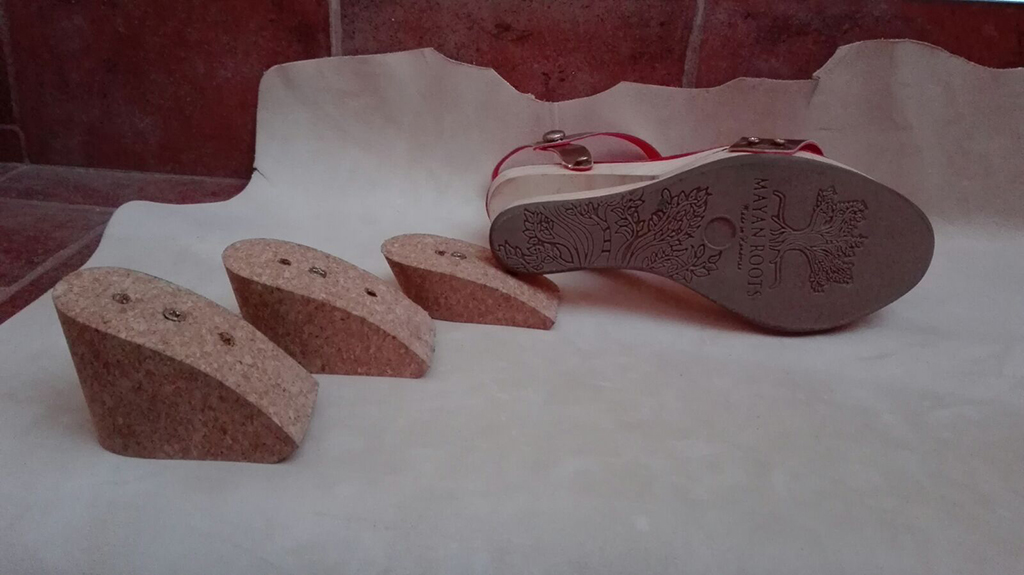 A mi Altura Sandalia compuesta por una plataforma de madera en dos piezas en forma de bisagra y cuñas intercambiables que vuelven el zapato más alto o más bajo.