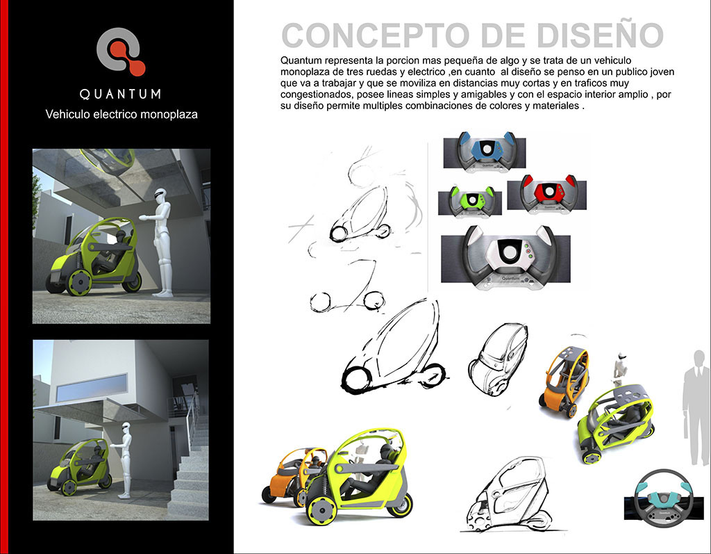 Es un vehículo eléctrico monoplaza de tres ruedas pensado para un público joven que va a trabajar y que se mueve en distancias muy cortas y tráfico muy congestionado. De líneas simples, amigables y alegre, por su diseño permite múltiples combinaciones de colores y materiales. Quantum es extremadamente compacto y sencillo, de dimensiones muy reducidas: 2.000×1.300×1.600 mm.