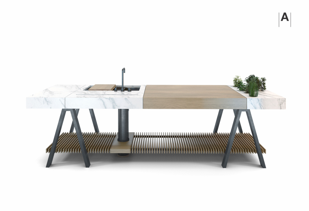 Como sistema integrado de mobiliario, incorpora planos de trabajo para diferentes usos y permite configuraciones según necesidades de cada usuario, transformando la mesa de cocina en una herramienta adaptable.