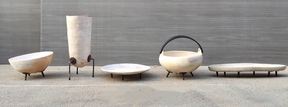 Las piezas combinan cerámica modelada a mano con técnicas ancestrales de la amazonia peruana y válvulas de neumáticos recuperados, cosidos a mano con cuerda.