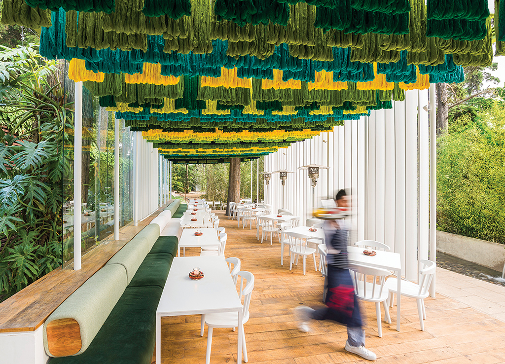 El Canopy no tiene únicamente un fin decorativo sino también funcional. Hecho con 1.000 libras de lana, colgado de la estructura metálica actúa tanto como parteluz solar que como elemento acústico, permitiendo que el espacio sea cómodo e íntimo.