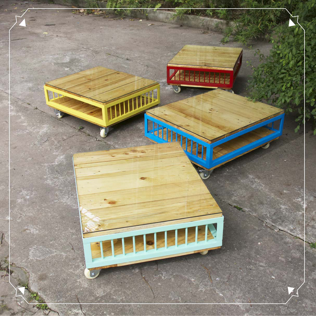 Es una instalación artística para ser vista en conjunto. También cumple su función separándose en piezas individuales únicas y de colección. Gira en torno a un concepto común, generar la conexión con el prisma, tanto en su condición óptica como geométrica. Sus colores, rojo, amarillo, azul, verde agua, evocan los tonos en que se fragmenta la luz al converger con un prisma. El concepto renace con la intención de abrir el espectro para dar lugar a viejas artes que comprenden el diseño de piezas utilitarias con valor artístico.Se han unido con esmero mano de obra y materiales reutilizados para dar vida a las piezas de diseño que conforman la instalación. Toda la madera usada es pino reutilizado e inmunizado proveniente de euro-pallets en desuso, así como el 10% del metal. Prisma es la armonía del amor. Nombres de las mesas: Pneumas / Sólidos Platónicos.