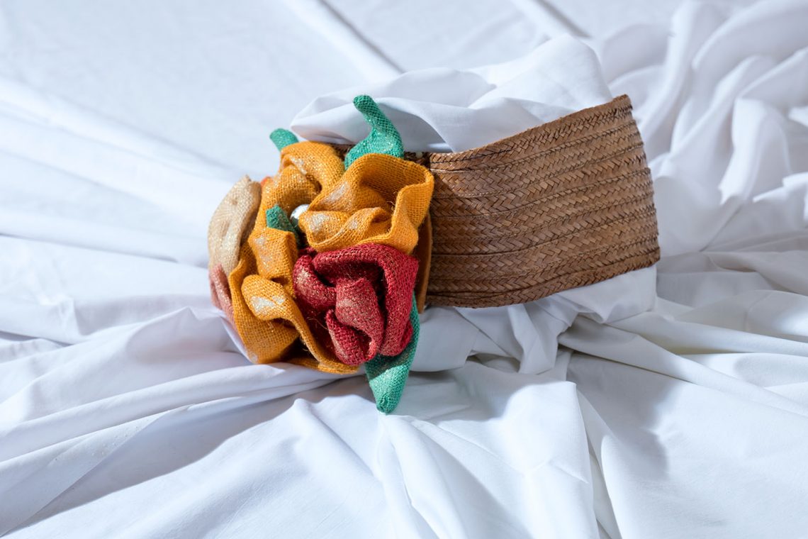 El sombrero se conforma por el ensamblaje de estas hojas, trenzadas y cosidas a mano. En combinación con el corsé, expresa la armonía entre la mujer y la tierra, las olas y el viento, los espíritus y los seres vivos. Medidas: 2,80 metros de largo por 1,50 de ancho.