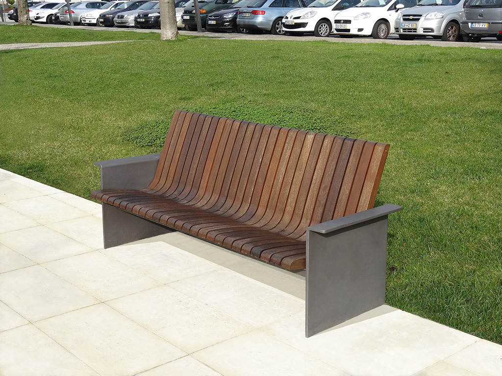 Asiento y respaldo se resuelven en madera noble trabajada manualmente, con acabado en barniz satinado. El sistema incluye versiones con y sin apoyabrazos y diferentes longitudes para múltiples escenarios urbanos.