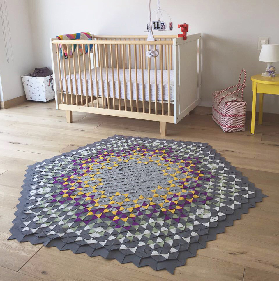 Nebulosa está tejido por medio de un sistema de ensamble hexagonal, que a partir de una pieza central ensambla los seis siguientes, explorando así su simetría y los patrones geométricos que esto crea. El degradado está formado por el cambio de color entre las piezas, generando así la profundidad de centro al exterior.