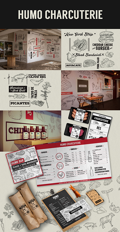 Humo Charcuterie Desarrollo gráfico que busca combinar elementos de un restaurante de parrilla tradicional con especies panameñas dándole un toque más autóctono y único a su cocina de carbón.