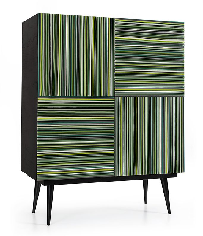 Mobiliario (Buff Hey y Bar) Piezas decorativas y mobiliario de madera con insertos de vidrio.