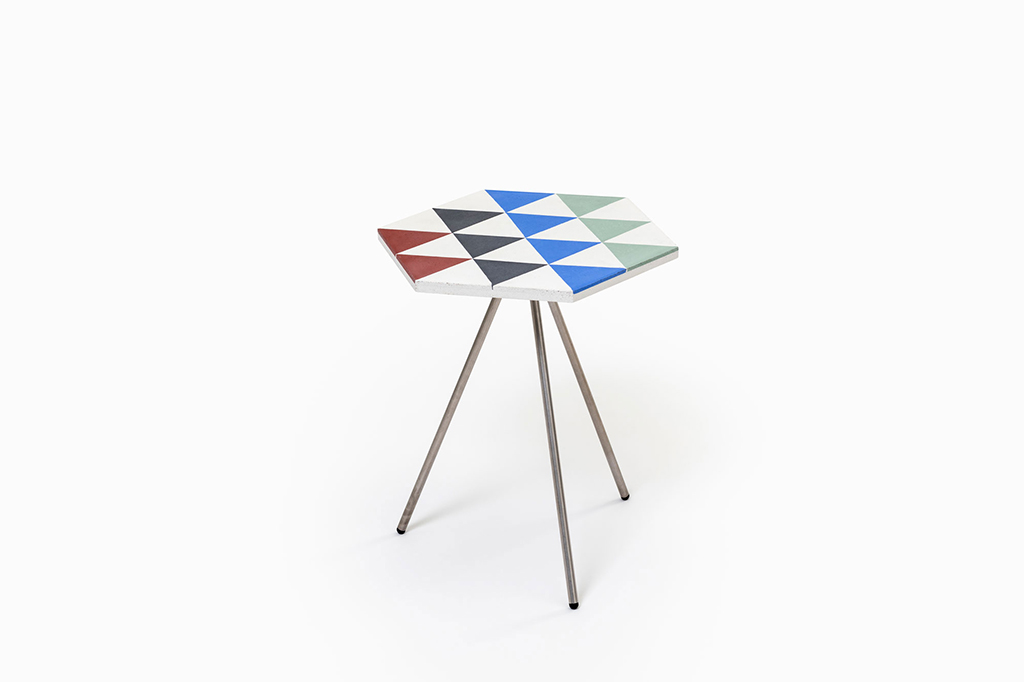 El reto del proceso de diseño ha radicado en resolver lo que no se ve: realizar una investigación de materiales para aligerar y estructurar el producto, así como intervenir en su proceso de fabricación tradicional para posicionar un inserto metálico que a modo de nudo sirve a la vez para armar el objeto y posicionar las patas en perfecta geometría. El resultado es una mesa tanto de interior como de exterior que ofrece la posibilidad de reproducir un pavimento elevado combinando tantas piezas como se desee.