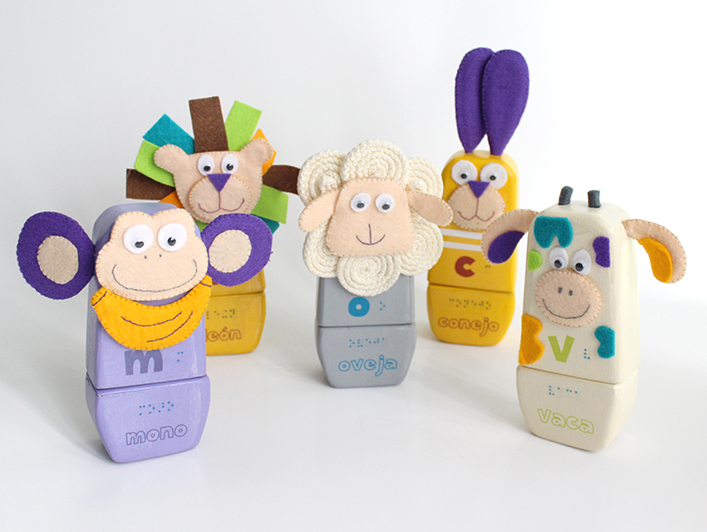 Cada pino está compuesto por dos piezas de madera balsa unidas a través de imanes. Una pieza contiene texturas y relieves que hacen referencia a un animal, la otra incluye la denominación del animal tanto en escritura convencional como en braille. Para empezar a jugar el niño debe identificar los animales y unirlos con su correspondiente nombre. Este producto didáctico y de acción despierta la creatividad e incentiva el desarrollo psicomotor y sirve también como introducción a la lectura convencional y al braille.