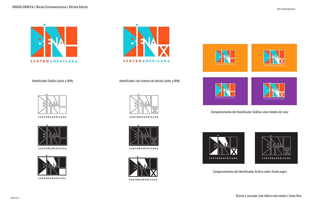 La gráfica entabla una “descomposición armónica” de un espacio dinámico mediado por las contraformas de las letras de la palabra “Bienal” que, en las aplicaciones, a veces se proyectan generando inusitadas percepciones del binomio positivo-negativo, cuando el signo tipográfico es fondo y en otras forma. El color ancla su valor de identificador al lado de la estructura, la forma tipográfica y el contenido de un símbolo que puede interactuar modularmente.