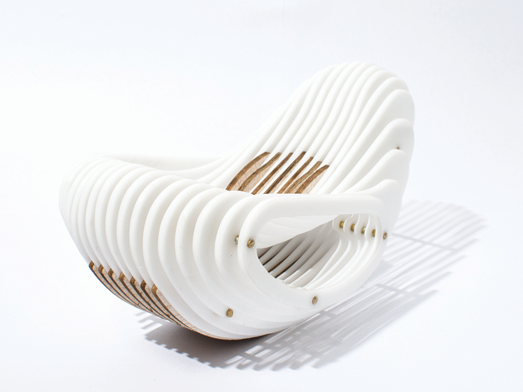 Silla Mecedora Meraki Silla que une la tradición de las sillas mecedoras con las nuevas tecnologías de fabricación en un diseño comercial, sostenible ecológicamente y de fabricación viable.