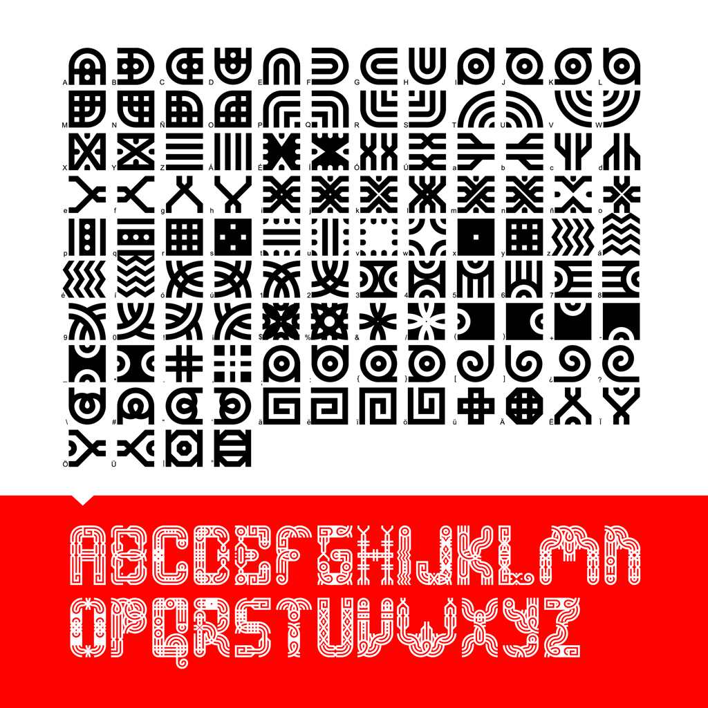 Modular 49 es una tipografía modular que nace de una serie de signos visuales de las culturas ancestrales de Ecuador que se obtuvieron del análisis de piezas arqueológicas, de los cuales se esquematizaron 112 signos, obteniendo de su combinación varias tipografías y patrones.>>Ambas fueron seleccionadas para la Bienal Tipos Latinos 2016.