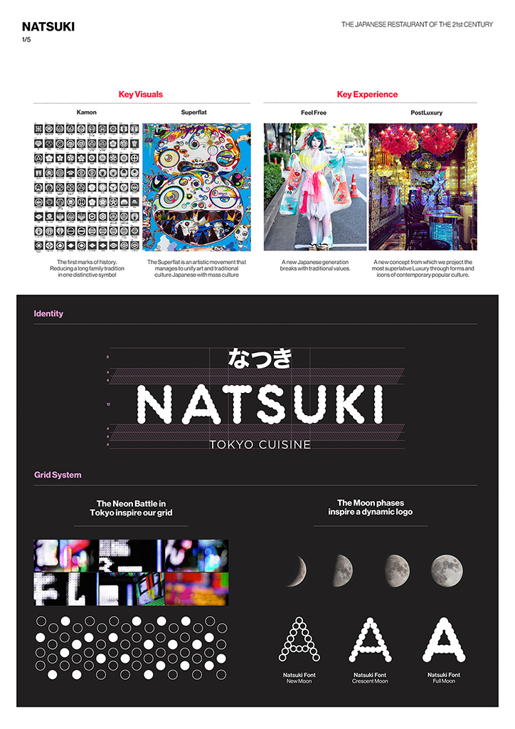 Para el diseño interior y arquitectónicoErretréstrabajó junto a Philippe Starck en tanto que el desarrollo de las piezas físicas y multimedia se realizó bajo la dirección creativa del artista japonés Houxo. Natsuki es la combinación perfecta entre Tradición/Ruptura y Minimalismo/Superflat que partiendo del Japón medieval logra convertirse en el restaurante japonés del siglo XXI. Una marca inspirada en los neones de Tokio y en las fases de la Luna da como resultado una propuesta simbolista y contemporánea.