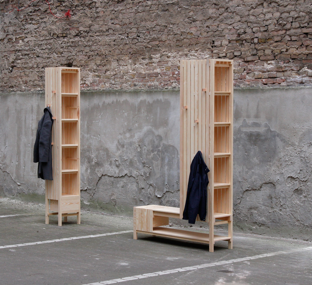 La propuesta integra ganchos desmontables en madera de haya y cajones correderos, con una construcción en pino sin nudos basada únicamente en uniones encoladas, sin tornillos ni tarugos. Esta decisión técnica refuerza la limpieza formal del mueble y evidencia un enfoque estructural coherente entre diseño y fabricación.