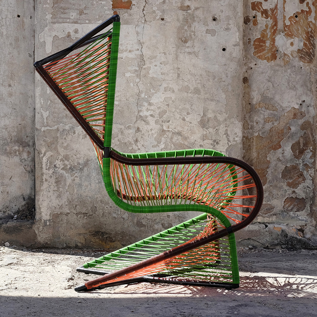 La silla Vibra está compuesta por una estructura de metal cubierta con cuerda plástica que proviene de materiales recuperados. Por su ligereza, resulta muy adecuada para las condiciones climáticas del país. El ritmo, la armonía y la fusión, factores imprescindibles en la creación musical, se reflejan visualmente en esta propuesta de diseño.