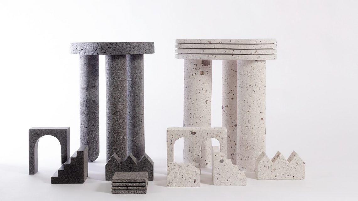 Colección de objetos en sillar y basalto que traduce investigación sobre paisaje limeño en piezas de uso cotidiano con enfoque artesanal y material.
