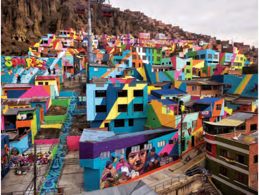 Desarrollado por Knorke Leaf en La Paz, el proyecto interviene cerca de 18.000 m² en altura y propone una narrativa visual que reivindica memoria ancestral y pertenencia territorial. La operación excede lo ornamental: convierte el barrio en un recorrido pedagógico y turístico de acceso abierto.