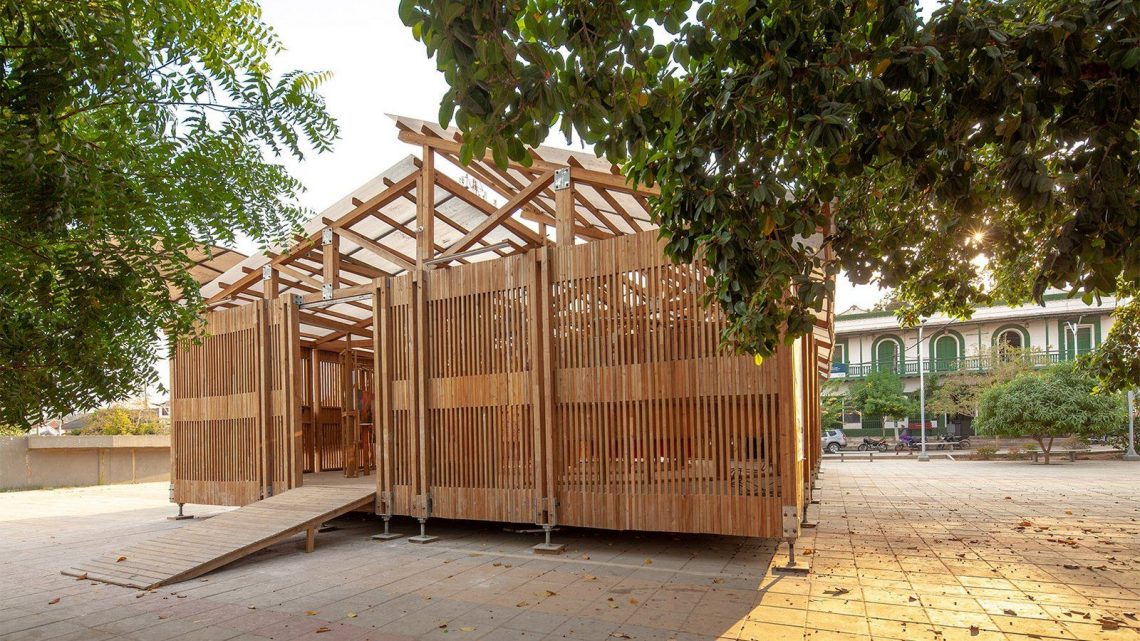 Su sistema modular en madera permite montaje y desmontaje ágil, optimizando traslado, almacenamiento y adaptación a distintos contextos. El diseño responde a cuatro premisas clave: modularidad, adaptabilidad, comportamiento bioclimático y sismo-resistencia, garantizando viabilidad técnica en operación itinerante.