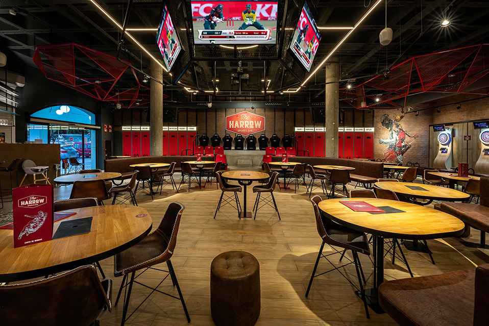 The Harrow SportBar es un proyecto integral de interiorismo desarrollado para Holidayworld, concebido como un espacio multidisciplinar para deporte, juego y experiencia gastronómica. La propuesta combina estética industrial con una narrativa visual dinámica y de alto impacto.