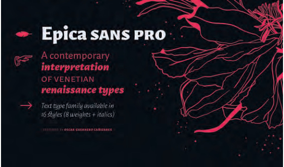 Epica Sans Pro interpreta las tipografías del renacimiento italiano desde una lógica contemporánea, equilibrando carácter formal y funcionalidad. Su construcción integra rasgos de tipos incisos y huellas caligráficas con una voz visual sólida.