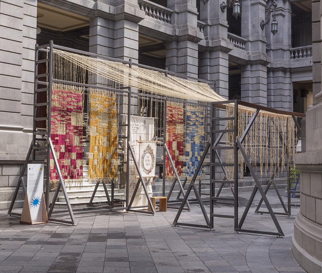 Desarrollado por Chuen MX y 1/8 Takamura, el proyecto construye una gran trama a modo de telar urbano y la remata con piezas inspiradas en el petate de tule, elaboradas con fibras blandas y duras. La propuesta incorporó diseño de telares de gran formato y bordado artesanal para integrar relatos personales en el espacio público.