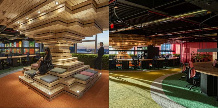 En 3.900 m², el proyecto propone espacios de colaboración y bienestar con una mezcla intencional de industria y artesanía: hamacas tejidas, sillas de madera y cuero, murales en fibra natural y piezas de arte infantil.