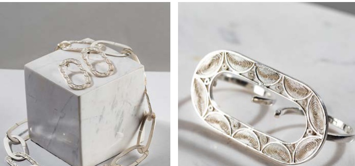 Colección inspirada en la curva catenaria que fusiona recta y arco en lenguaje formal. Une filigrana tradicional con orfebrería contemporánea en piezas de autor. En conjunto, el proyecto transforma investigación y práctica en una solución visual coherente con dinámicas actuales de comunicación y uso.